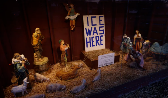 The priest---Father Stephen Josoma, Pastor of Saint Susanna Parish---had, earlier that week, removed the figures of Jesus, Mary and Joseph from the display, and replaced them with a sign which read: ICE WAS HERE, implying that the Holy Family would have been arrested by ICE.
