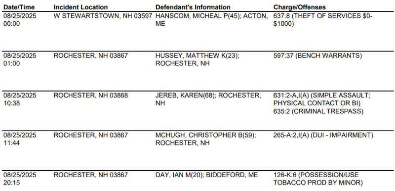 Rochester Police Arrest Log for Aug. 25