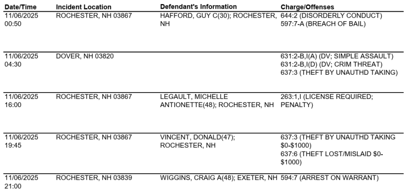 Rochester Police Arrest Log for Nov. 6